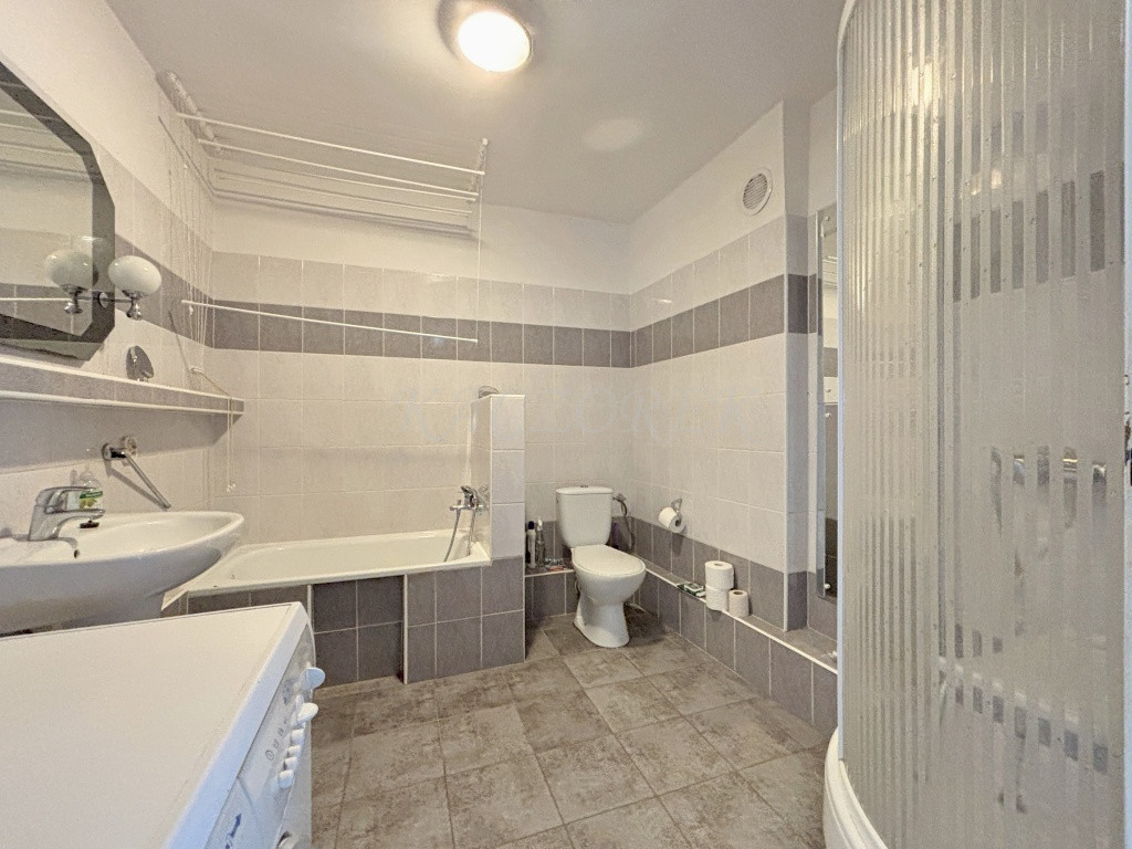 - łazienka z wanną, kabiną prysznicową, umywalką, pralką i WC