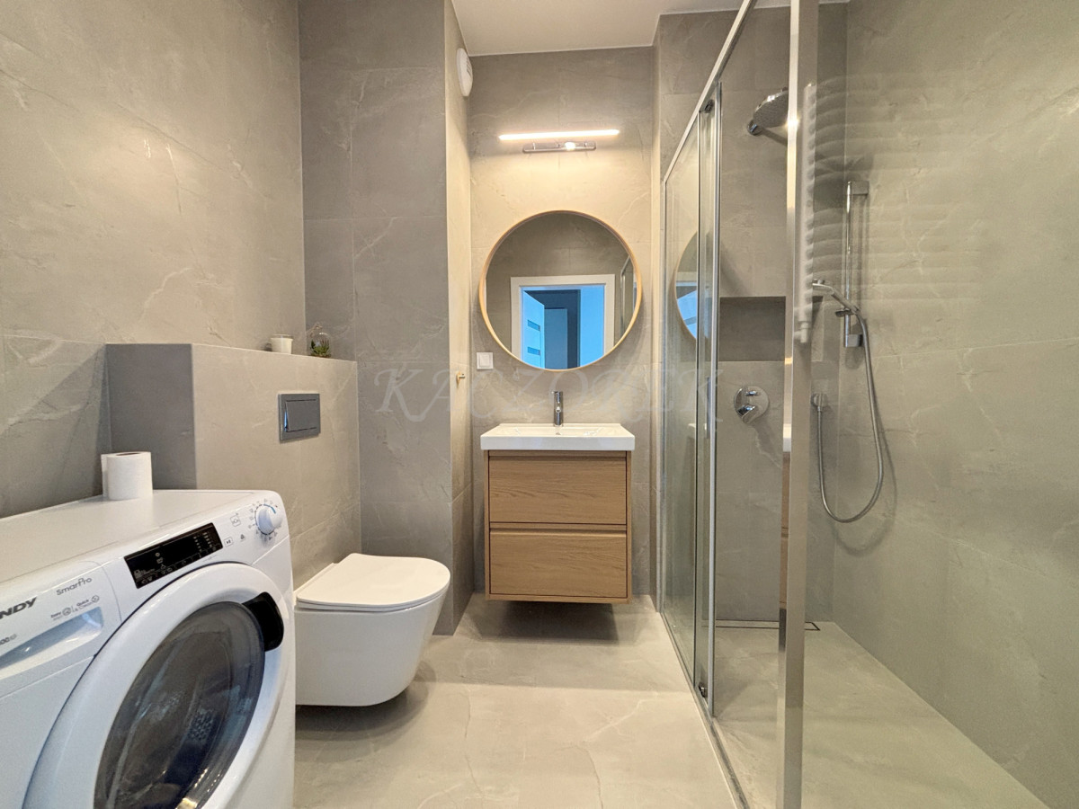 - łazienka z dużą kabiną prysznicową, WC, umywalką oraz pralko-suszarką