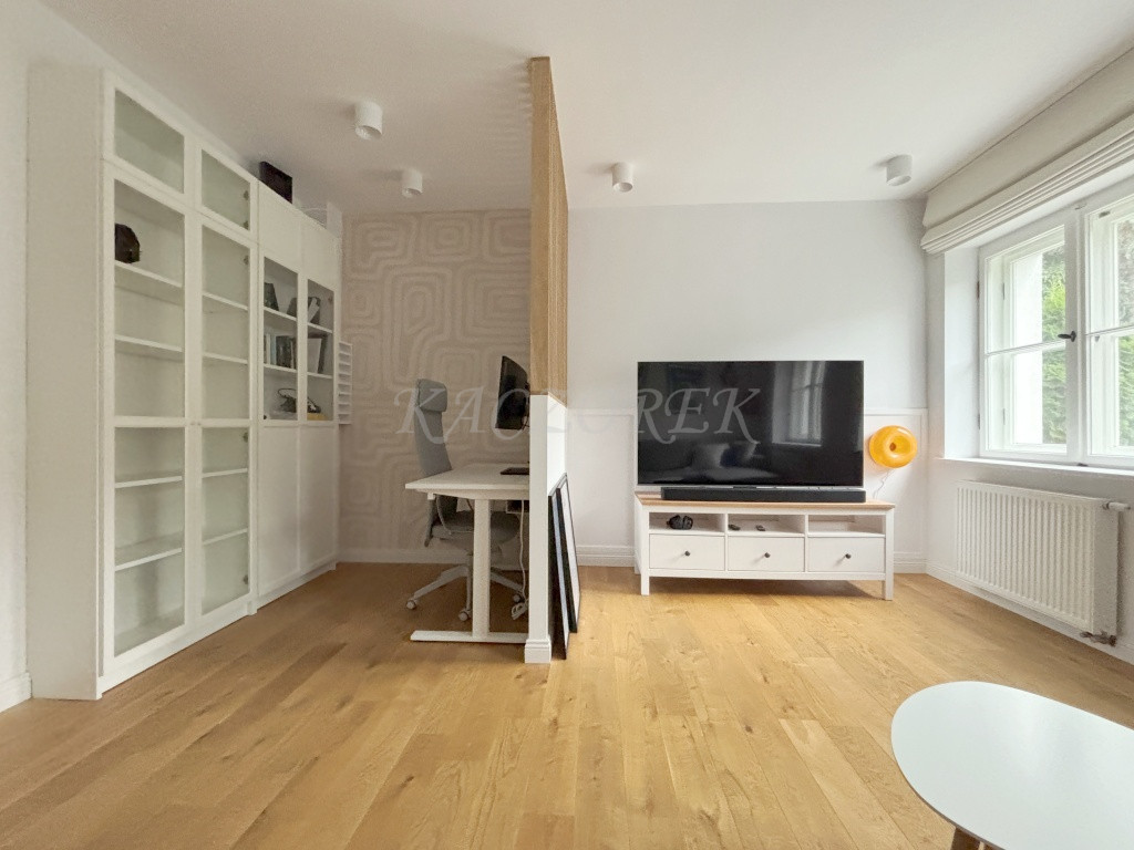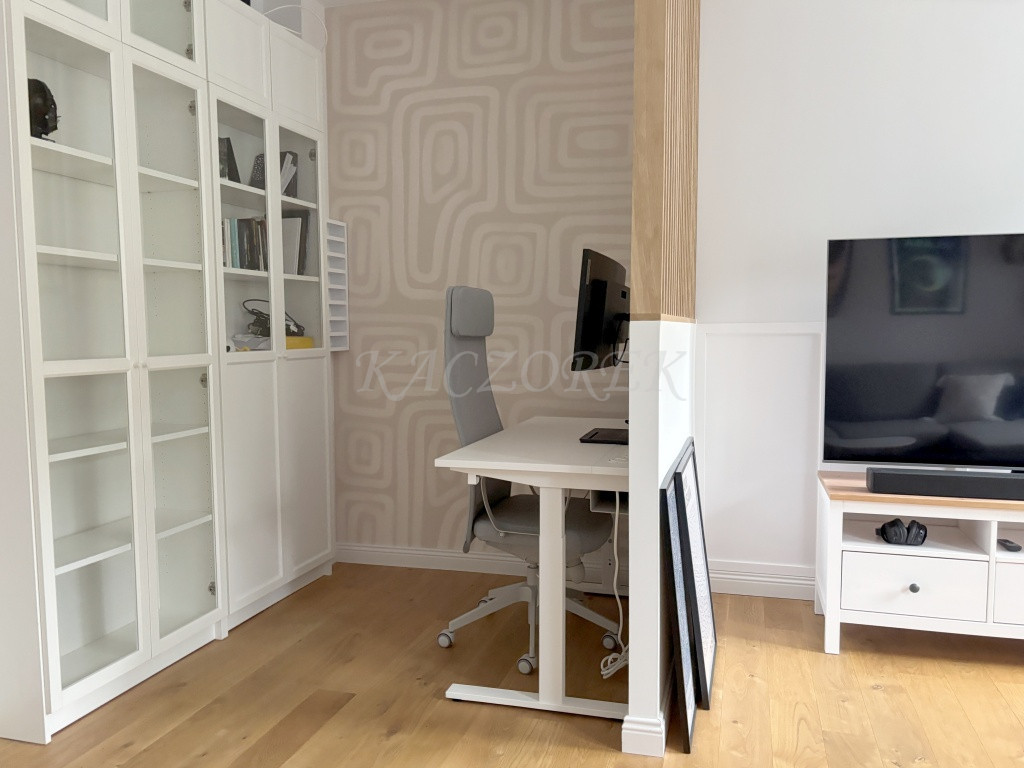 Pokój dzienny: ok. 18m2, przedzielony jest małą ścianką z lamelkami na dwie strefy - wypoczynkową i biurową. Wyposażony jest w meble oraz sprzęty widoczne na zdjęciach: biurko, krzesło, 2 regały, rozkładana sofa narożna, szafka pod TV, komoda, 2 wiszące drewniane lampy ozdobne, Telewizor SAMSUNG QE65Q80D 65" QLED 4K, Soundbar HISENSE U5120GW.