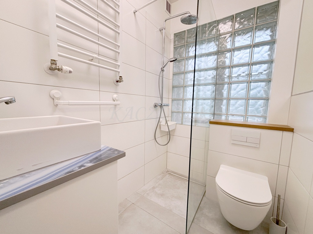 Łazienka: ok 3m2, wyposażona w kabinę prysznicową walk-in, umywalkę oraz wc.