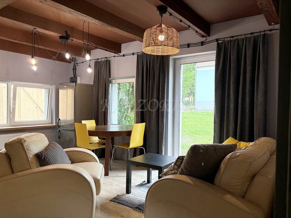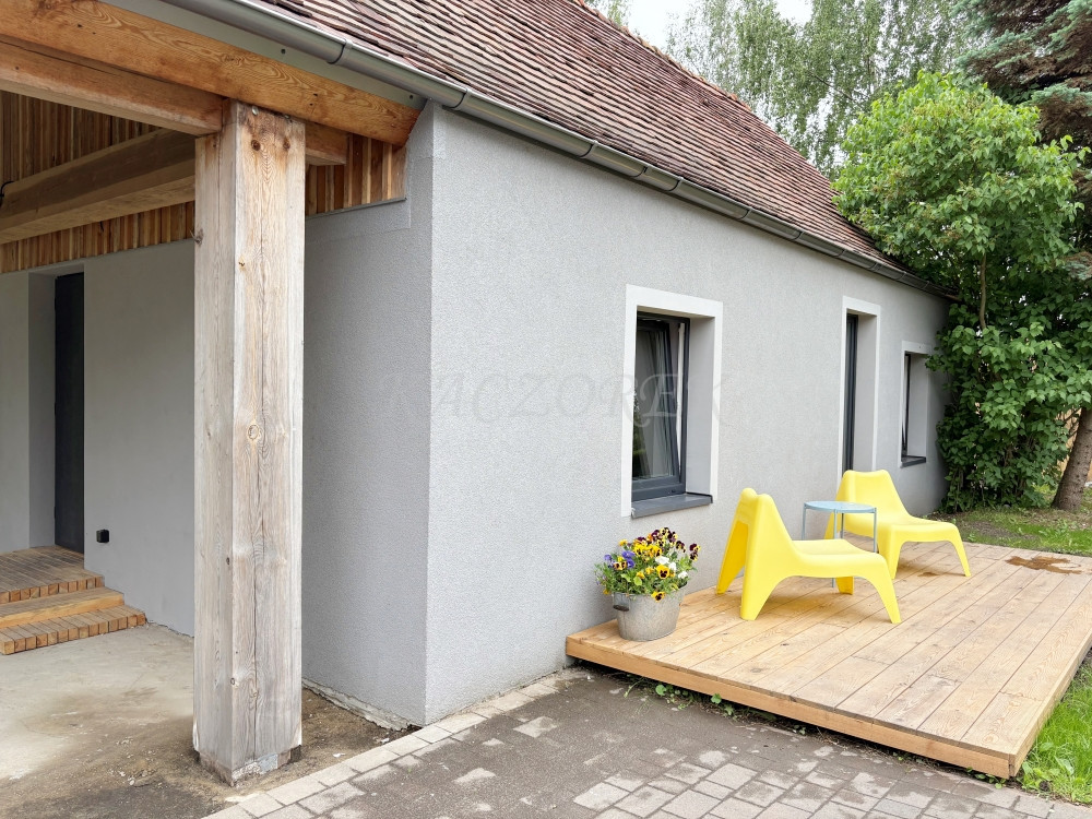 Domek, gruntownie wyremontowany w 2025roku, jest położony na działce, obok większego domu w Borkowie.